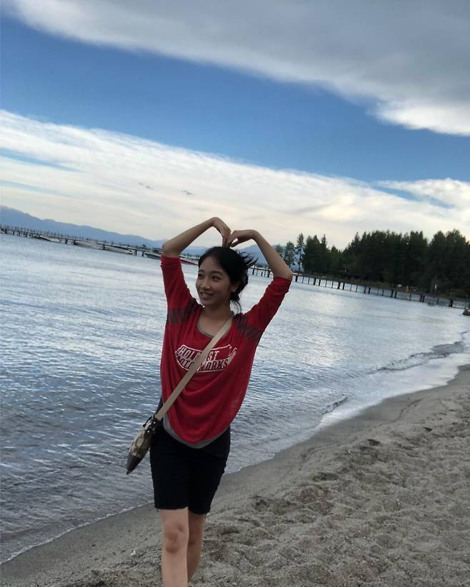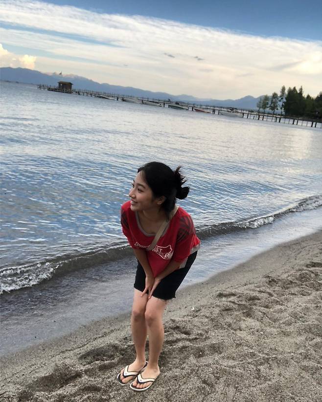 바닷가의 유나킴은 소박하고 편안한 차림 속에서 환한 웃음을 지었어요.