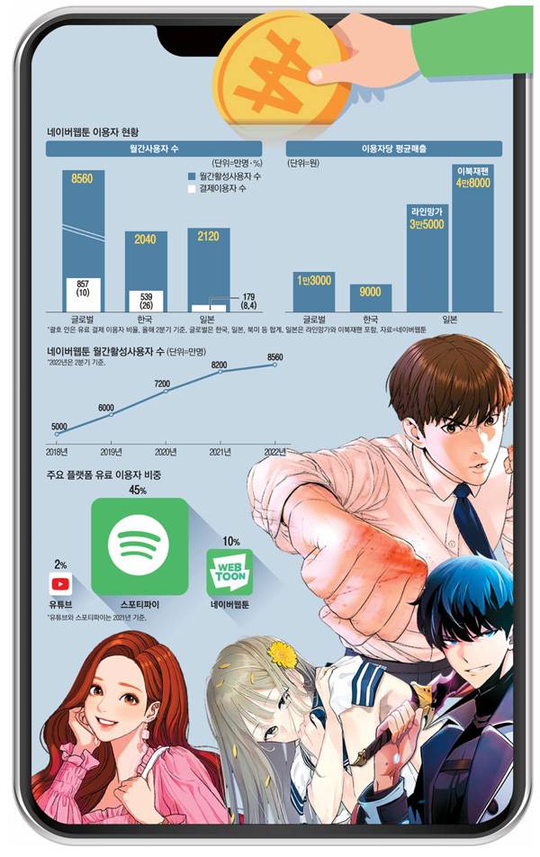 네이버웹툰은 2012년 업계 최초로 '미리보기' 유료 서비스를 도입했다. 유료 회차를 기다려서 웹툰을 무료로 보거나, 결제를 통해 미리 볼 수 있는 모델을 한국에 적용한 것이다. 2019년 약 6000억원이었던 전 세계 전체 거래액이 2021년 1조원을 돌파한 데는 한국 시장의 역할이 가장 컸다.