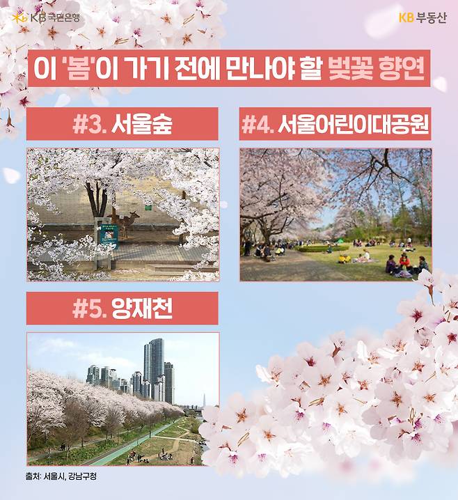올 봄에도 벚꽃 시즌을 맞이해 가족이나 연인끼리 나들이를 계획하시는 분들 많이 계실 것 같은 데요. KB부동산에서 놓치면 후회할 서울 벚꽃 명소 5곳을 추려 소개합니다.