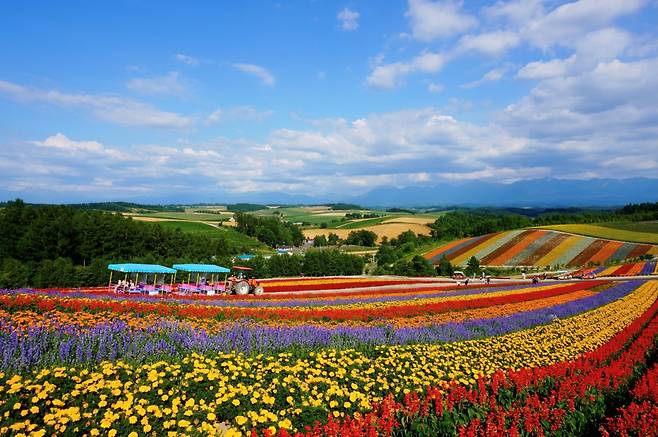 완만한 구릉에 둘러싸여 있는 비에이 지역에서는 5~10월이 되면 각종 꽃 축제로 분주합니다. 많은 관광객들이 넓은 지대에 화려하게 핀 꽃들을 보기 위해 방문하기 때문이죠. 그중 가장 유명한 장소로는 ‘ 시키사이노오카’가 있는데요.