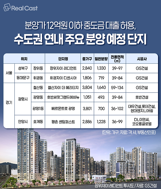 최근 금리 인상으로 대출 이자 부담이 날로 높아지고 있는 가운데 분양이 미뤄졌던 서울 대규모 랜드마크 아파트들이 분양 소식을 알려왔습니다. 청약을 고려할 때 가장 중요한 부분이 자금을 어떻게 마련하고 납부할 지일 것입니다. 리얼캐스트가 중도금 대출규제 완화로 자금마련에 여유가 생긴 단지를 모아봤습니다.
