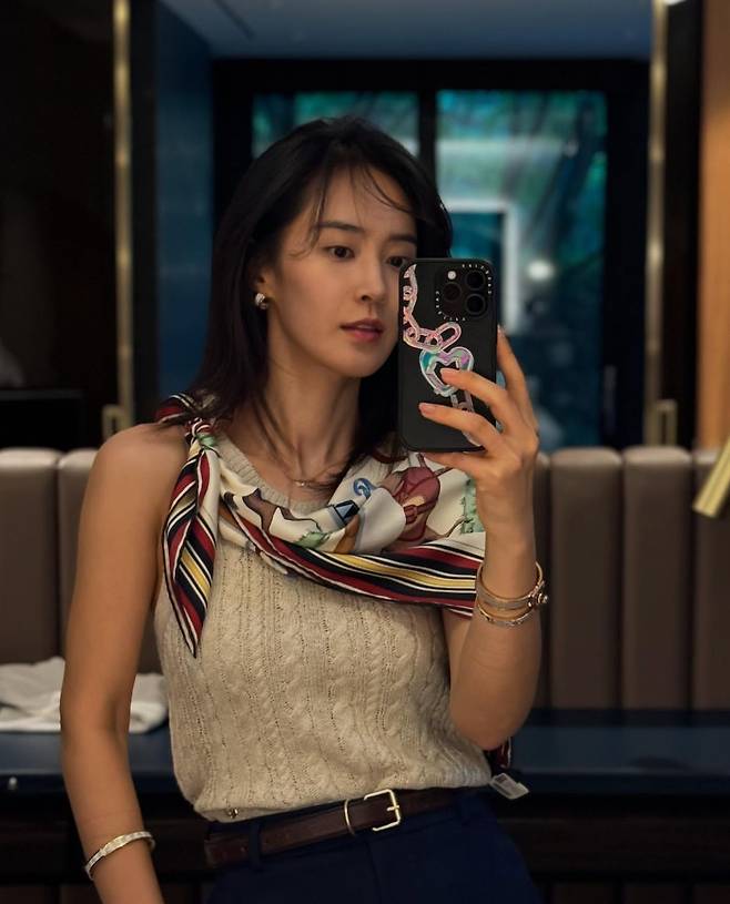 권유리는 니트 슬리브리스 톱과 함께 화려한 패턴의 스카프를 매치해 세련된 분위기를 연출하고 있다. 베이지색 니트 톱의 클래식한 케이블 패턴과 다채로운 색상의 스카프가 조화를 이루며 고급스러운 느낌을 자아낸다. 골드 액세서리와 함께 스타일링된 이 룩은 캐주얼함 속에 우아함을 더하며, 세련된 도시 여성의 이미지를 완성하고 있다.