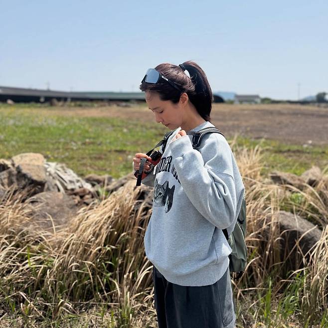 자연을 배경으로 한 권유리는 라이트 그레이 그래픽 스웨트셔츠와 어두운 하의를 매치한 실용적인 아웃도어 룩을 선보이고 있다. 머리에 올린 선글라스와 포니테일 헤어스타일은 활동적인 느낌을 더하며, 카메라를 들고 있는 모습에서 여행을 즐기는 그녀의 일상이 엿보인다. 편안함을 추구하면서도 스타일을 놓치지 않는 실용적인 패션 감각을 보여주고 있다.