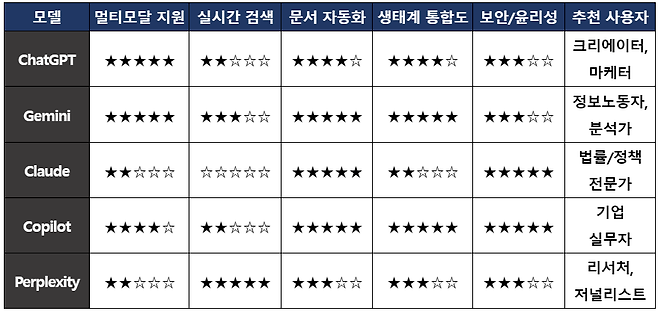 이런 흐름 속에서 국내외 대표 챗봇 5종의 프리뷰를 준비했다. 대상 챗봇은 OpenAI의 ChatGPT, Google의 Gemini, Anthropic의 Claude, Microsoft의 Copilot, Perplexity.ai다. 모두 GPT-4 또는 그에 준하는 초거대 언어모델을 기반으로 하며, 각각의 서비스는 검색 보완, 문서 작성, 코딩 지원 등 특정 강점을 바탕으로 차별화된 사용자 경험을 제공하고 있다. 생성형 AI 시장의 현재를 가볍게 훑어보기에 좋은 기준점이 되는 조합이다.