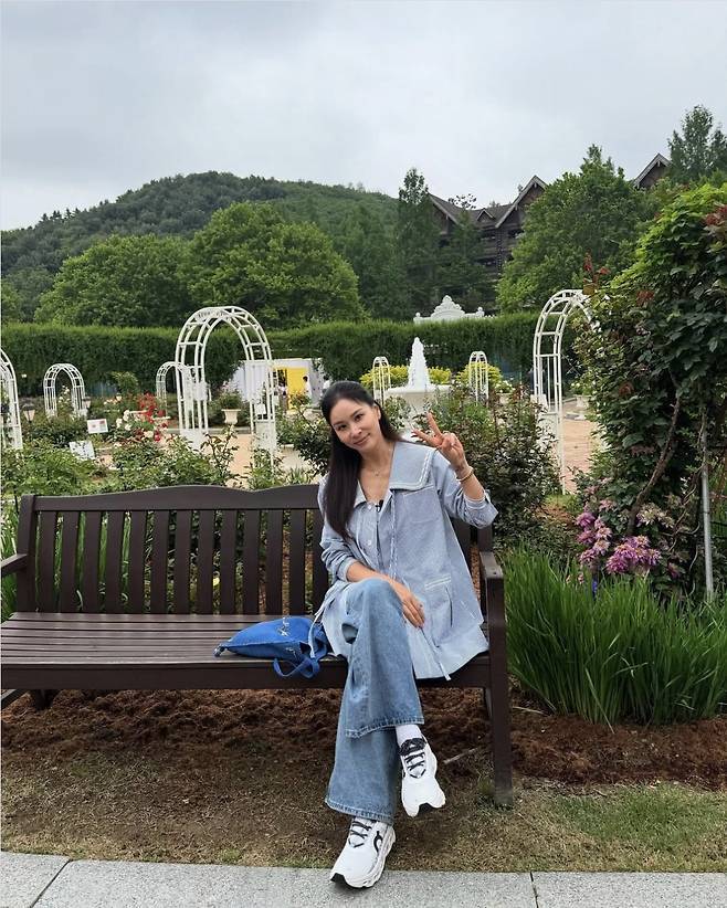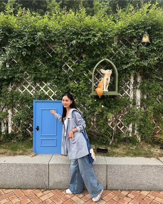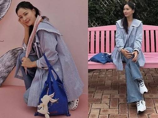 특히 소매를 자연스럽게 걷어 올려 꾸민 듯 안 꾸민 듯한 ‘꾸안꾸’ 스타일을 보여줬고, 하의는 발등까지 흘러내리는 롱 기장의 데님 팬츠로 다리 라인을 더욱 길어 보이게 연출했습니다.