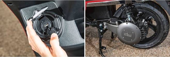 배터리를 두 개 넣으면 주행거리는 두 배가 된다. 트렁크 공간을 모두 배터리가 차지해 소지품을 보관하지 못하는 것은 아쉽다. 발판 앞에 수납공간을 마련해 두었지만 헬멧을 걸 수 있는 고리 하나 정도는 있었으면 좋겠다. 다행히 디자인과 잘 어울리는 전용 탑케이스가 옵션으로 준비되어 있다.