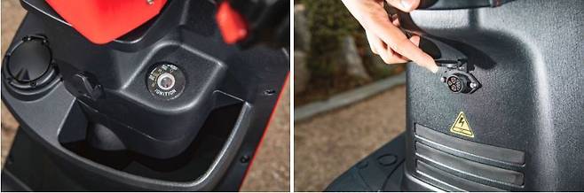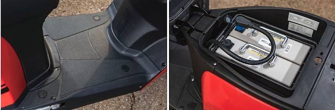 평평하고 넓은 발판은 타고 내리기 쉽고 박스 같은 짐을 올려두기도 편하다. 배터리는 시트 아래 둔다. 키를 왼쪽으로 돌리면 시트가 열린다. 트렁크 공간엔 2개의 배터리를 보관하거나 배터리 하나와 충전기를 보관할 수 있다. 커넥터를 살짝 돌려 차량과 배터리를 체결하는 방식으로 간단하지만 확실하게 결합되어 선이 빠지거나 합선되는 일에 대한 걱정이 없다. 선 하나만 딱 빼내면 배터리를 뺄 수 있고 배터리 무게 자체도 한 손으로 들기에 크게 무리 없는 무게다.