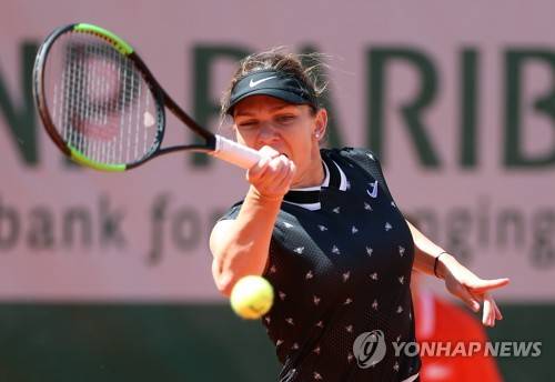 epa07617193 Simona Halep of Romania plays Lesia Tsurenko of Ukraine during their women?s third round match during the French Open tennis tournament at Roland Garros in Paris, France, 01 June 2019. EPA/SRDJAN SUKI