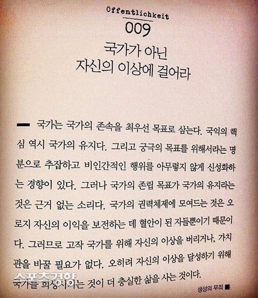 그가 올린 글귀는 ‘니체의 말 2’에 실린 ‘어떻게 살 것인가’와 ‘국가가 아닌 자신의 이상에 걸어라’ 단락이다.