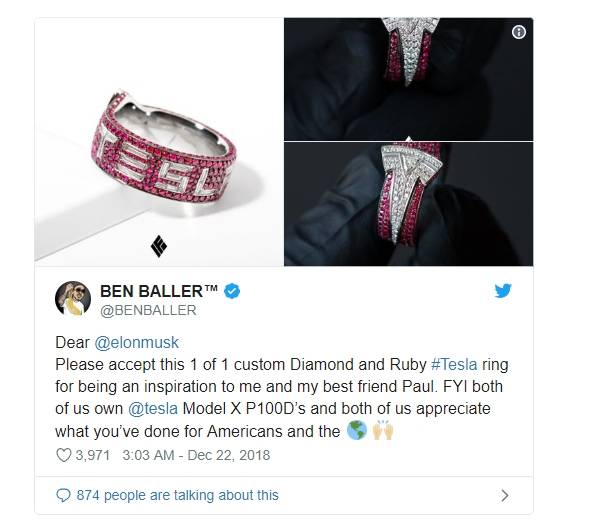 밴 볼러(Ben Baller)로 더 잘 알려진 스타들의 보석상 벤 양(Ben Yang)은 지난해 일론 머스크 테슬라 CEO를 위해 3만7000달러(한화 약 4300만원)의 테슬라 반지를 만든 바 있다.