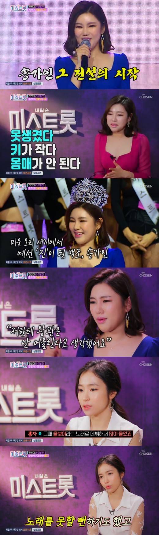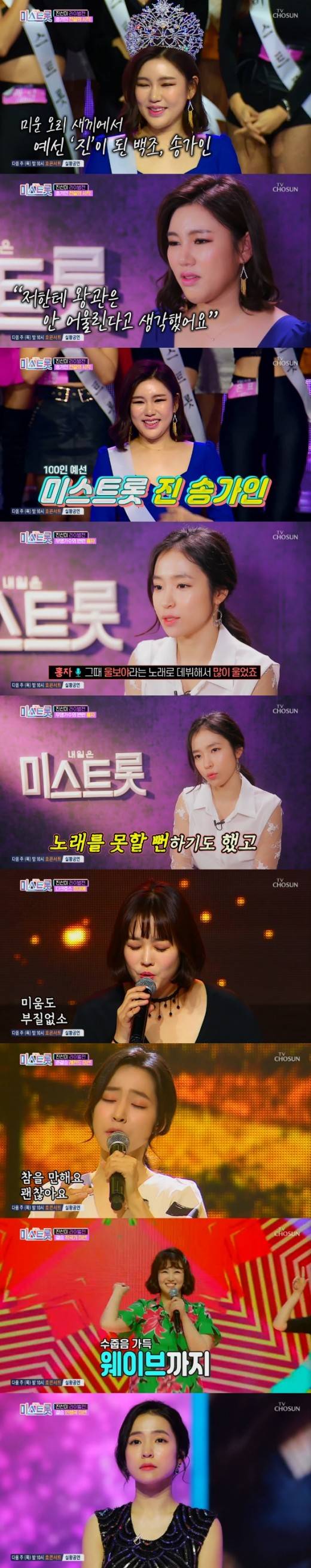 하지만 예선 진에 오른 송가인. 그는 "이게 뭔 일인가 싶었다"면서 "예쁜 사람이 많은데 하필이면 못생긴 내가 왕관을 써서 전체적인 그림이 별로일 것 같다고 생각을 했다. 제가 왕관은 안 어울린다고 생각을 했다"고 눈물을 보였다.