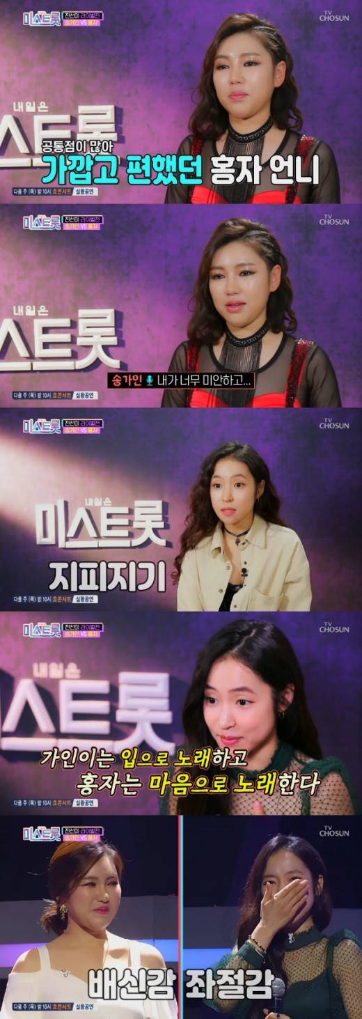 데스매치 직전까지 두 사람은 냉랭한 기운을 이어갔다. 송가인은 "홍자 언니랑 따로 연락을 못했다"면서 "연락을 안한다. 언니가 밤마다 메시지를 했는데 안 온다"고 털어놓기도 했다.