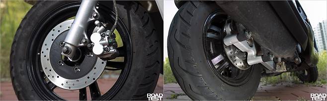 작은 타이어도 교체 주기가 무척 짧다. 1년 밖에 안 된 바이크라 타이어 상태를 살펴보지 않았는데, 약 11개월 탔을 때 즈음 뒤 타이어 펑크로 정비소에 들렀더니 트레드가 완전히 닳아있었다. 지름이 작은 데다 뒷바퀴를 굴리는 까닭이다. 반면 앞 타이어는 아직 수명이 한참 남았다.