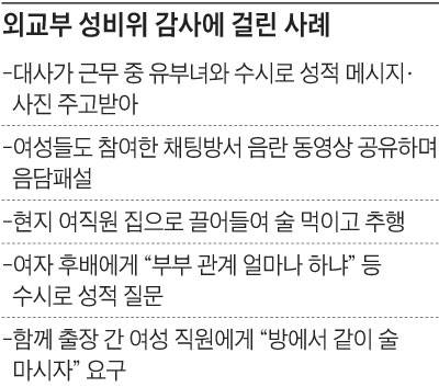외교부는 성 비위 감사 보고서를 내부 통신망을 통해 전 직원에게 공개했다. 보고서에는 비위 행태가 구체적이고 적나라하게 묘사돼 있다고 한다. 당사자 이름은 익명 처리돼 있지만, 사례에 나오는 지역·화폐단위 등 간접 정보를 조합하면 대충 누군지 유추할 수 있는 수준이다. 보고서를 본 한 직원은 "단순히 경각심을 불러일으키겠다는 정도가 아니라 확실하게 망신을 줘서 일벌백계하겠다는 의도로 읽혔다"고 했다. 외교부 당국자는 "부처 특성상 남녀 직원이 함께 해외 근무를 하거나 출장 갈 일이 많은데, 아무래도 해외에 나가면 긴장감이 풀어지기 때문에 상대적으로 사고가 날 가능성이 높다"고 했다.