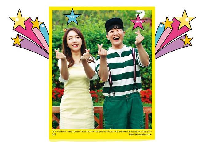어린이날을 앞둔 지난달 30일. 어린이 독자들을 즐겁게 해주려고 서울 공덕동 한겨레신문사 사옥에 ‘아이들의 어벤져스’ 중 잘 놀아주기를 담당하는 히어로 둘이 모였다. 위험에 처한 어린이 독자를 지켜줄 <모여라 딩동댕> ‘번개맨’과 ‘번개걸’은 1일 경기 고양시 일산 <교육방송>(EBS) 사옥에서 뭉쳤다.