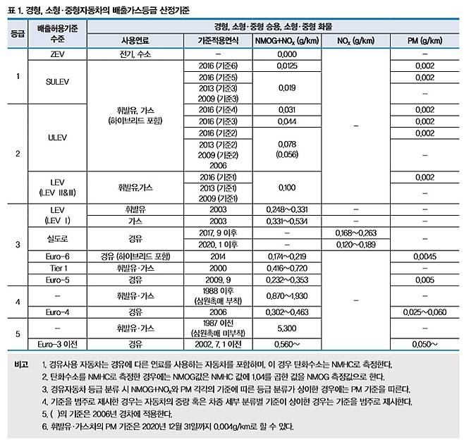 4) 경형, 소형 중형자동차의 배출가스등급 산정기준은 <표 1>과 같다.