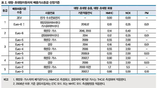 5) 대형·초대형자동차의 배출가스등급 산정기준은 <표 2>와 같다.
