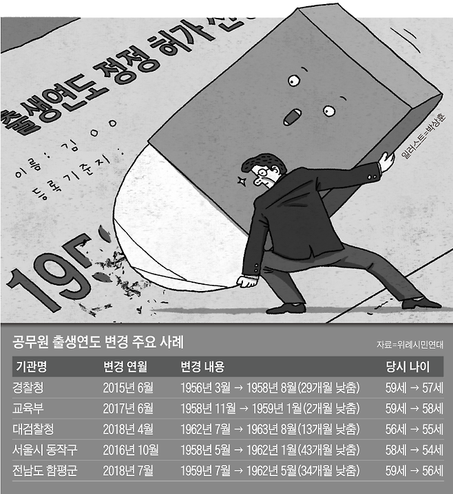 퇴직을 앞두고 나이를 줄이는 공무원이 늘어나고 있는 것으로 나타났다. 시민단체 위례시민연대가 지난달 15일부터 한 달간 중앙부처, 지방자치단체, 교육자치단체의 공무원 출생연월 정정 사례를 조사한 결과, 2015년 1월부터 올해 5월까지 총 166명이 출생연월을 바꾼 것으로 나타났다. 이 중 94.5%인 157명이 나이를 줄였다. 줄어든 평균 나이는 1년 18일이었다. 2년 이상 줄인 공무원도 20명이나 됐다.