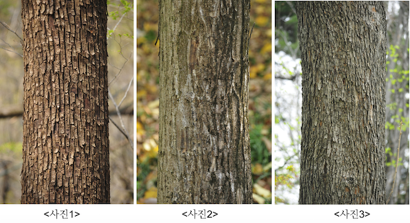 <사진1> XX나무 : 짙은 흑갈색이고 세로로 길게 갈라진다. <사진2>OO나무 : 어릴 적에는 갈라짐이 거의 없다. <사진3>OO나무 : 큰 나무가 되면 세로로 잘게 갈라진다.