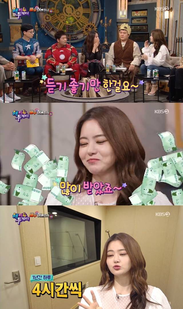 서유리는 “1년 동안 하루 4시간씩 주 5회 녹음을 했다. 돈을 많이 받았다”고 말해 출연자들의 관심을 한몸에 받았다. 서유리는 “비밀 유지 계약을 써서 몇 단어를 녹음했는지는 말을 못 한다. 한마디만 하자면 요구하는 부분이 상당히 많았다”고 덧붙였다. (사진=KBS 2TV ‘해피투게더 시즌4’ 캡처)