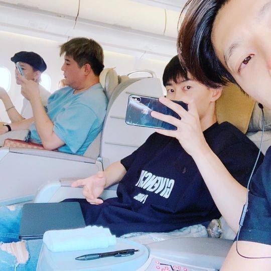 공개된 사진 속 동해는 이동 중인 비행기 안에서 은혁, 신동, 예성의 모습을 찍고 있다.