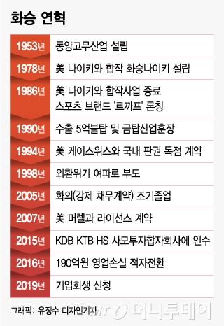 ◇'기차표 고무신'부터 나이키, 르까프, 케이스위스까지…영광과 위기의 '국민 브랜드'=화승의 모태는 1953년 설립된 동양고무산업으로 본다. 이 회사는 국내 신발 1호라고도 일컬어지는 '기차표 고무신'을 탄생시켰다.