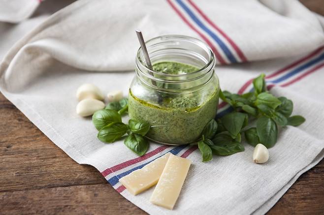 스위트 바질을 깨끗이 씻어 물기를 제거한 다음, 마늘과 잣, 치즈가루, 올리브오일과 함께 믹서에 넣고 간다. 여기에 소금과 후추로 간을 하고 유리병에 담은 뒤, 공기와의 접촉을 막기 위해 올리브오일을 조금 붓는다. 완성된 바질 페스토는 냉장 보관하면서 2주 내에 먹는 것이 좋고 냉동 보관하면 최대 3개월까지 보관할 수 있다. 파스타는 물론 빵 스프레드나 김밥 소스, 달걀 프라이까지 다양한 요리에 활용해보자.