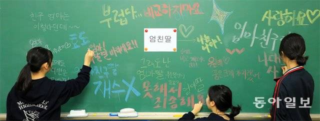 | ‘엄친딸’하면 떠오르는 말, 여고생들 답은… 5일 서울 무학여고 1학년 3반 학생들이 ‘엄친딸’에 대한 생각을 칠판에 쓰고 있다. 학생들은 ‘비교하지 마세요’ ‘엄마! 바랄 걸 바라세요!’ ‘나 자체로 좋아해줘요♡’ 같은 솔직한 글로 더 이상 ‘엄친아’를 추구하지 않는 자신들의 가치관을 보여줬다. 전영한 기자 scoopjyh@donga.com |