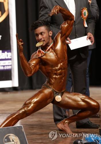epa07342973 An Indian bodybuilder holds a gold medal in his mouth after he won as he flexes his muscles during Junior National Bodybuilding championship in Jammu, the winter capital of Kashmir, India, 04 February 2019. At least 270 bodybuilders from around the country participated in the 57th Junior National Bodybuilding championship 2019 organized by Jammu and Kashmir state amateur Bodybuilding association. EPA/JAIPAL SINGH