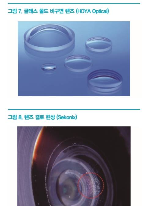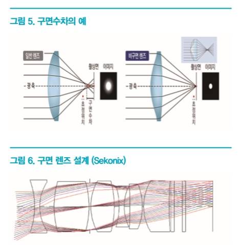 플라스틱 렌즈가 주로 사용되어지는 휴대폰 카메라와 달리 자동차용 카메라에서는 상대적으로 높은 온도의 환경하의 성능 확보를 위하여 글래스 계열의 재질이 주로 쓰인다. 그러나, 글래스 렌즈는 구면렌즈의 단점인 구면수차 극복을 위하여 복수의 렌즈를 사용하게 되어 원가상승의 요인이 되며, 생산 수율의 저하로 이어지게 된다.