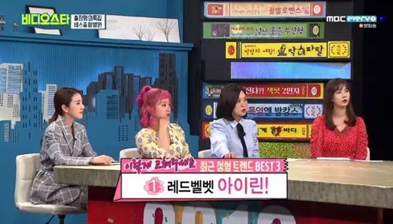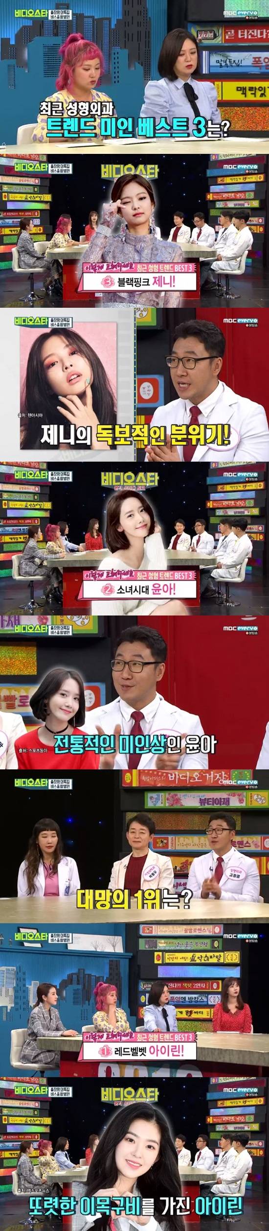 김종명이 말한 3위는 블랙핑크 제니. 제니의 무쌍커플에 독보적인 분위기를 원하는 환자들이 많다고. 이어 2위는 전통적인 미인상인 윤아가, 1위는 또렷한 이목구비를 가진 레드벨벳 아이린이 뽑혔다. (사진=MBC에브리원 ‘비디오스타’ 캡처)