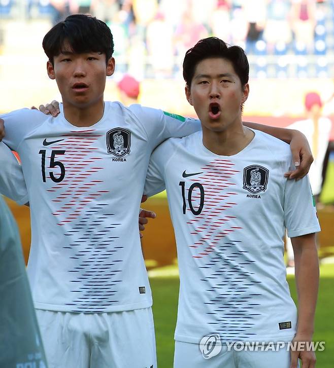 (루블린[폴란드]=연합뉴스) 홍해인 기자 = 4일 오후(현지시간) 폴란드 루블린 경기장에서 열린 2019 국제축구연맹(FIFA) 20세 이하(U-20) 월드컵 16강 한·일전에서 이강인이 힘차게 애국가를 부르고 있다. 2019.6.5