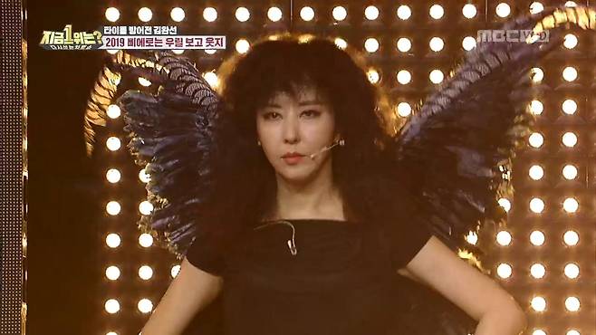 이어 음악이 잠시 멈추며 문이 열리고 검정 깃털을 단 김완선이 등장해 좌중을 압도하는 무대를 선보인다.
