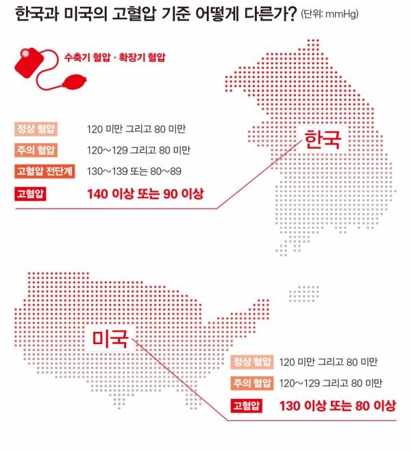 고혈압 1100만 명 시대다. 2018 한국 고혈압 현황 자료(국민건강영양조사 1998~2016)에 따르면, 한국인 성인의 29%가 고혈압이다. 성인 3명 중 1명은 고혈압인 셈이다. 또 세계보건기구(WHO)의 세계질병부담연구(GBD)가 2013년 모든 사망 위험요인을 분석한 결과, 고혈압이 1위에 올랐다. 흡연(2위), 과일 섭취 부족(3위), 비만(4위), 당뇨(5위)보다 고혈압에 의한 사망 위험이 크다고 판단한 것이다. 이에 따라 미국심장학회는 2017년 고혈압 기준을 '수축기 혈압 130mmHg 이상'으로 수정했다. 국내 고혈압 기준은 '수축기 혈압 140mmHg 이상'이다.