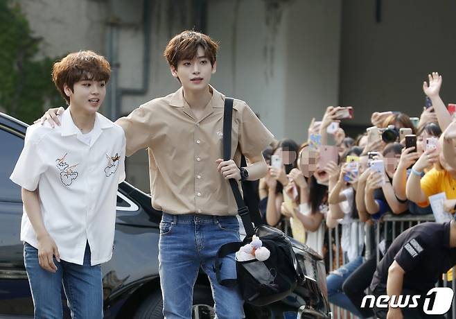 (인천=뉴스1) 권현진 기자 = 연습생 송형준, 구정모(가) 30일 오전 인천 부평구 인천삼산월드체육관에서 열린 M.net '프로듀스 X 101' 콘셉트 평가 블루카펫 세리머니 출근길에 참석하고 있다. 2019.6.30/뉴스1