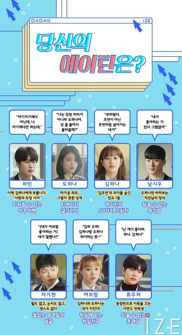 [‘도하나병’. V오리지널 웹드라마 ‘에이틴’의 주인공 도하나를 따라하는 10대들의 욕구를 일컫는 신조어다. ‘에이틴’ 시리즈가 인기를 얻으면서 도하나의 칼단발 헤어스타일과 양말을 짝짝이로 신은 모습, 할 말을 단호하게 하는 태도를 일부 학생들이 콘셉트 삼아 따라한다는 게시물이 올라왔고 도하나를 연기한 배우 신예은이 ‘도하나병’을 직접 언급하기도 했다. 도하나뿐만 아니라 ‘에이틴’ 시리즈에 등장하는 캐릭터들은 솔직하고 분명한 10대들의 개성을 보여준다. 당신의 취향에 맞는 ‘에이틴’은 누구일지, 그들의 캐릭터를 정리했다.]