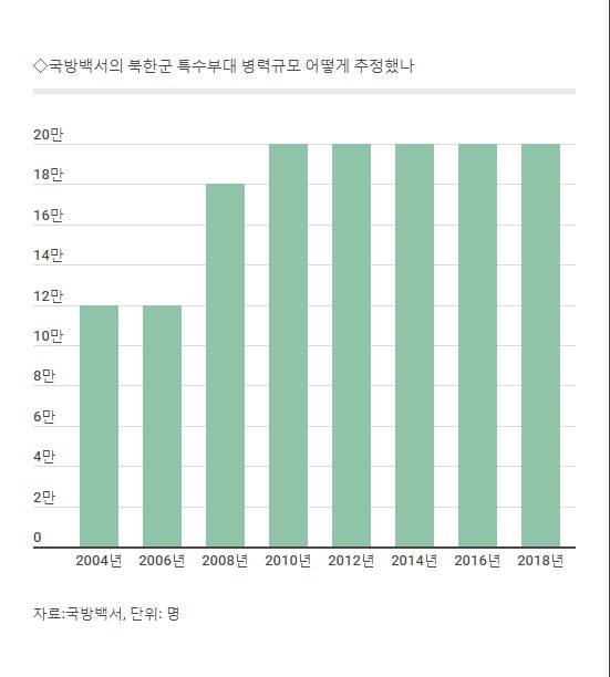 그리고 국방백서에서의 북한군 특수부대 병력 규모 평가는 2010년 20만명으로 증가했다. 북한군의 특수부대 병력이 늘어나는 동안 전체병력은 큰 차이가 없었다. 쉽게 말하자면 2006~2010년 4년 동안 북한군 8만명이 특수부대로 '업그레이드'됐다는 의미다.