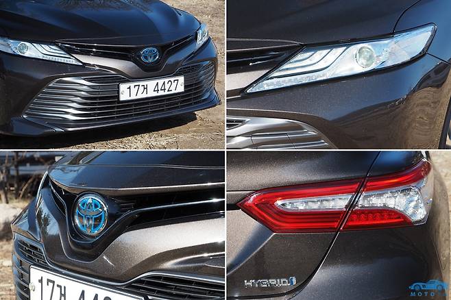 캠리의 전면부는 날카로운 인상이 강하다. 가느다란 헤드램프 안쪽에는 바이빔(Bi-Beam) LED 헤드램프가 자리하고 있으며 범퍼 대부분을 차지하는 전면 에어인테이크가 시선을 사로잡는다. 라디에이터 그릴 중앙에 자리한 토요타 엠블럼은 하이브리드 차량임을 상징하는 푸른색의 배경색이 적용되어 있다.