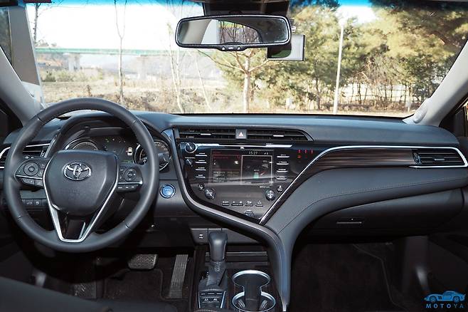 운전석에 앉고 나서 가장 먼저 체감하게 되는 것은 바로 탁 트인 전방 시야다. 낮은 천장을 지니고 있음에도 전면과 측면 모두 시선에 걸리는 것이 거의 없어 상당한 개방감을 느낄 수 있다. 세단형 차량 중 이정도로 시원스러운 전방 시야를 가진 차는 찾기 어렵다. 캠리의 윈드스크린과 대시보드는 일반적인 세단에 비해 낮게 설계되어 있고, A필러도 굉장히 작고 얇게 디자인되어 있다. 사이드미러는 사각(死角)을 저감하기 위해 도어 패널에 마운트되는 방식을 사용했다. 이렇게 전방위적으로 시야 확보에 힘쓴 덕분에 운전 환경이 쾌적하다.