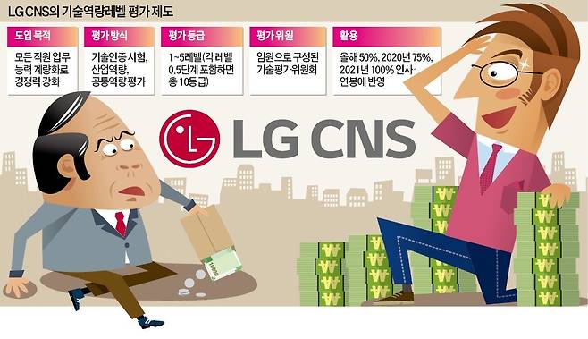 13일 IT업계에 따르면 시스템통합(SI) 업체인 LG CNS는 올해부터 직원들의 연봉 인상률 산정 시 기술역량 레벨을 50% 반영한다. 2021년부터는 100% 적용할 계획이다.