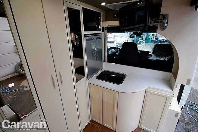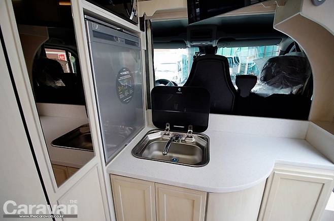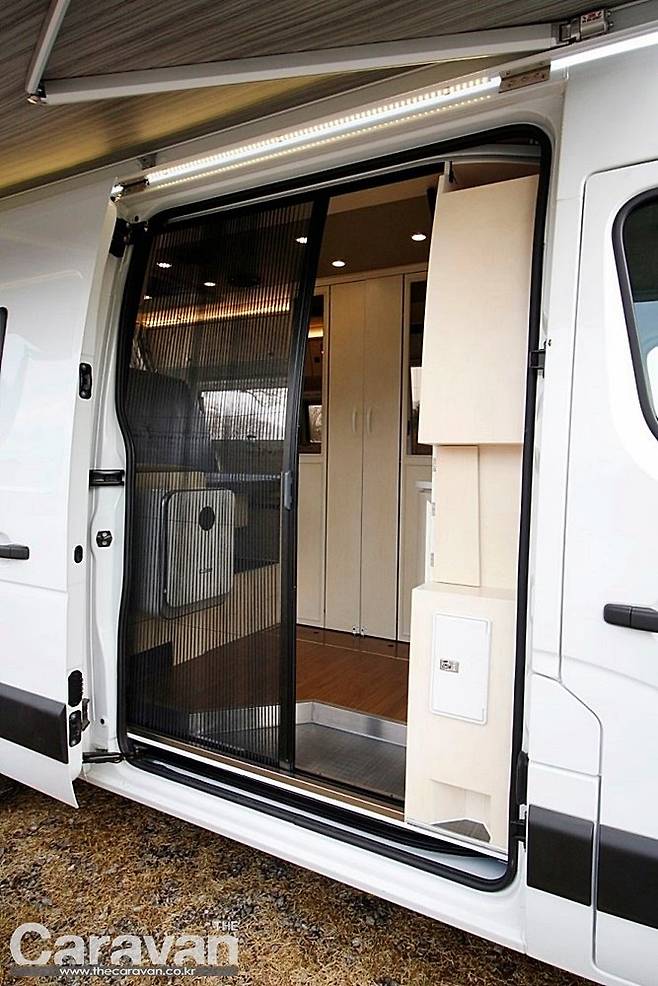 캠핑카의 출입구는 세련된 형태로 마감되었다. 다른 모델들보다 입구가 넓은 느낌이다. 출입구 우측은 고정 시설과 주방이 위치하고 출입구 맞은편이 한 뼘 이상 안으로 들어가 훨씬 넓은 모습이다. 바로 가변형 출입구를 설치해 사용 시에는 확장하고 이동시와 평상시에는 공간의 움직임에 초점을 두었기 때문이다.