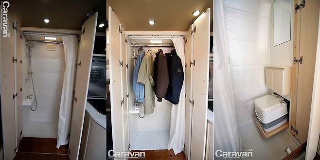 가변형 도어는 출입구 도어가 총 4개로 구성되어 있다. 좌우 2개씩 이어져 있어 닫으면 좁게, 경첩을 기준으로 90도 꺽어서 활용하면 공간의 모서리 기둥으로 활용된다. 샤워실겸 화장실 구조로 휴대용 포타포티 변기가 격벽 내부에 수납되고 이런 변형이 필요없을 경우는 넓은 옷장겸 다용도실로 활용할 수 있다. 수입 모터홈에도 이런 레이아웃을 볼 수 있는 모델이 있었는데 공간에 대한 효율성을 위해 약간의 번거로움은 감수해야 한다.