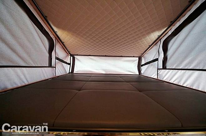 바닥판을 내린 상태의 이층 침대 위는 기존의 팝업과 비슷하며 텐트의 감성과 추가 구성원의 취침이 가능해 실속형이다. 물론 하단부의 리빙룸 변형이 필요치 않아 2개의 공간 구성이 장점이 된다.
