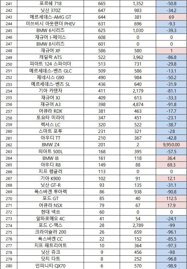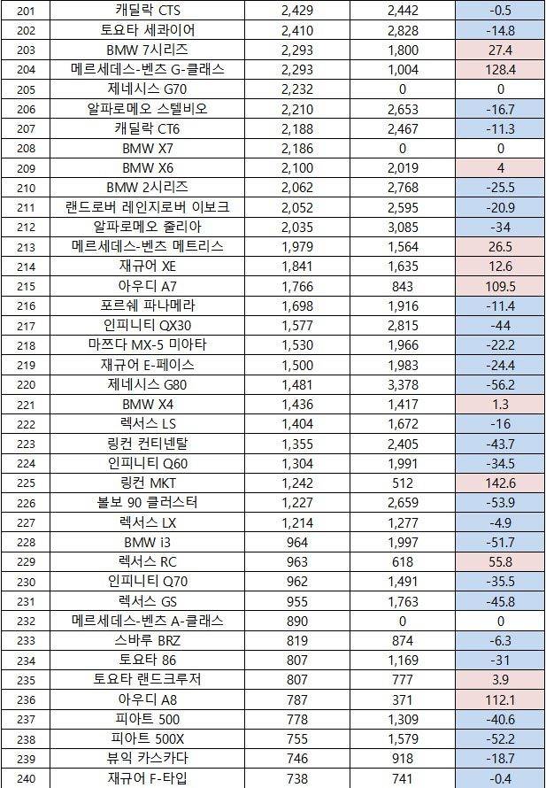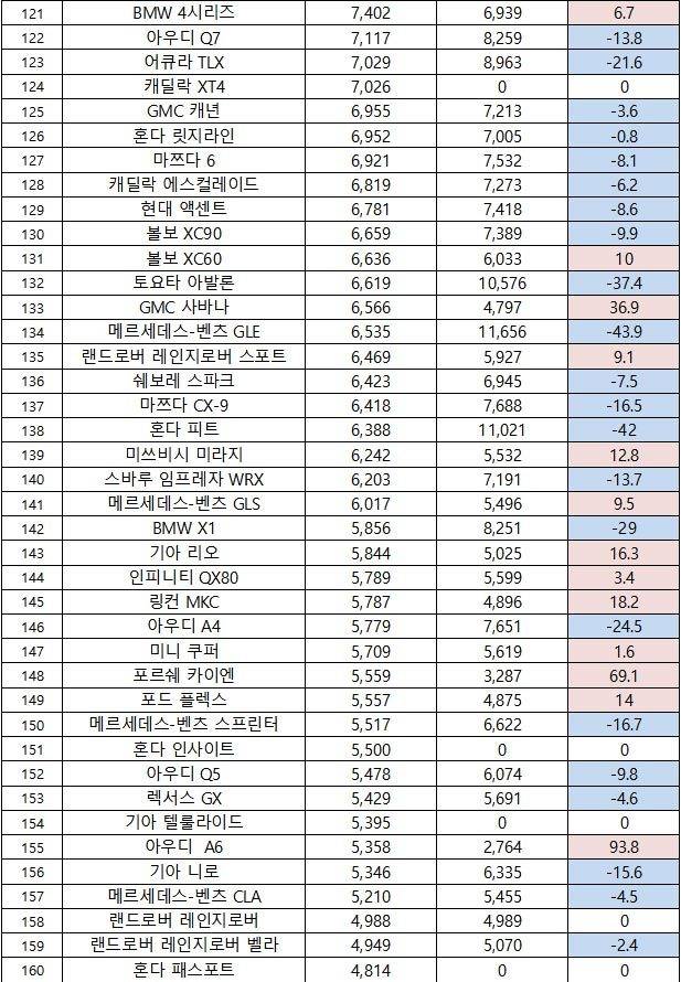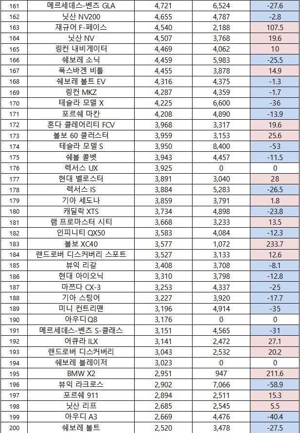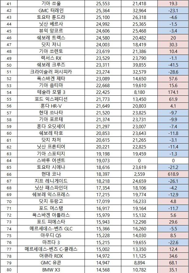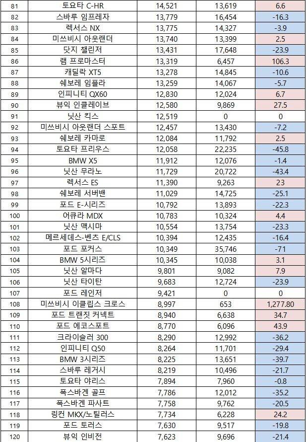 국산 제조사는 현대 엘란트라(국내명 아반떼)가 전체 27위를 기록했다. 참고로 토요타 코롤라와 혼다 시빅은 각각 9위와 10위로 여전한 인기를 끌고 있다. 대신 현대 투싼과 싼타페의 인기가 상승세를 타고 있어 현대차의 판매량을 견인하고 있다.