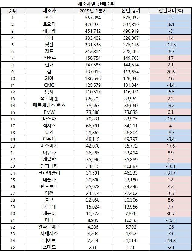 제조사별 판매량은 포드가 선두로 토요타가 2위, 쉐보레가 3위를 기록했다. 이어서 혼다, 닛산, 지프 순이며 현대차는 스바루 다음인 8위를 기록 중이다. 현대차가 스바루보다 적은 판매량을 보이고 있는데, 2018년보다 격차가 커졌다는 점이 눈에 띈다. 기아차는 10위에 이름을 올렸다.