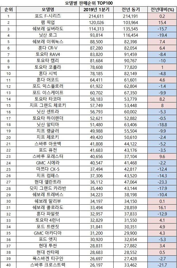 포드 F-시리즈는 1분기에 21만 대가 넘게 팔리면서 경쟁 모델과 선을 달리하는 인기를 누리고 있다. 램의 픽업트럭은 쉐보레 실버라도보다 많이 팔리는 이변을 낳았다.