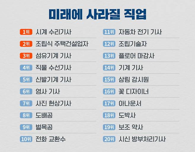 반면에 사라지는 직업도 있습니다. 시계를 착용하는 인구가 감소하면서 시계 수리기사(watch repairer), 조립식 주택 건설업자(builder of prefab homes), 섬유기계 기사(textile machine operator) 등이 이에 해당합니다.