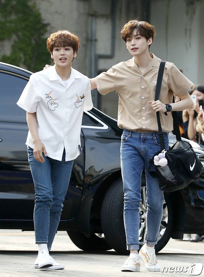 (인천=뉴스1) 권현진 기자 = 연습생 송형준, 구정모(오른쪽)가 30일 오전 인천 부평구 인천삼산월드체육관에서 열린 M.net '프로듀스 X 101' 콘셉트 평가 블루카펫 세리머니 출근길에 참석하고 있다. 2019.6.30/뉴스1