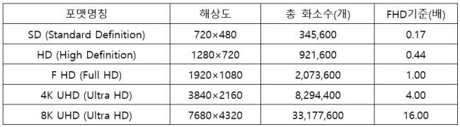 이전 SD(Standard Definition)급은 해상도가 ‘720X480’로 총 화소수는 34만5600개다. 이후 HD(High Definition), FHD(Full HD), 4K UHD(Ultra HD), 8K UHD가 개발되면서 해상도는 급격하게 높아졌다. 최근에 출시된 8K UHD는 총 화소수가 3300만에 달한다. FHD에 비해 16배 가량 화질이 개선됐다.