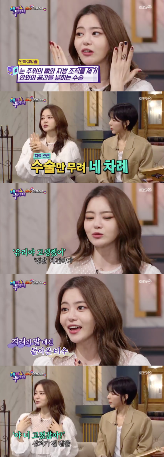 또 서유리는 “눈을 뽑아서 지방 조직을 제거하고 눈을 다시 넣는 큰 수술이다. 수술만 네 번을 했다. 3년 정도 투병하고 완치되면 고생했다고 격려해줄 줄 알았는데 성형했다고 하니 상처받았다”라고 솔직하게 털어놓았다.